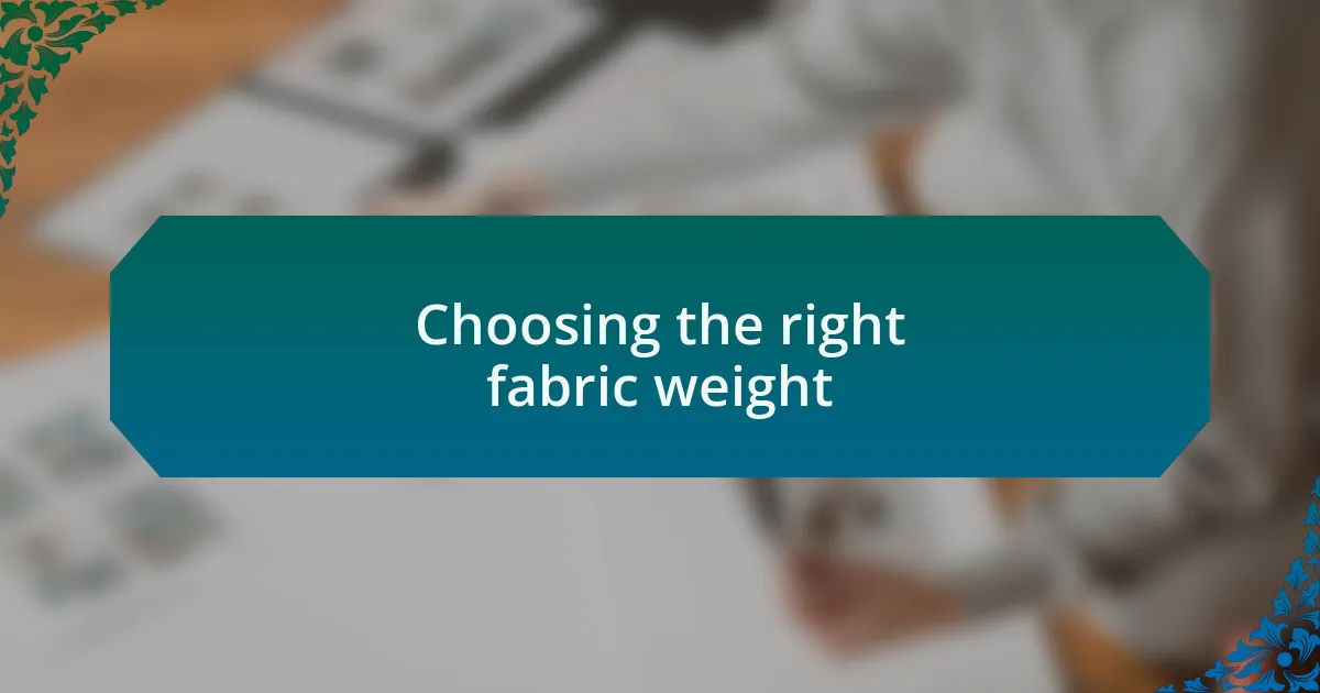 When choosing fabric weight, think about the end use of your project. I remember a time when I used a heavier canvas for making tote bags; it felt remarkably sturdy and supportive. Have you ever started a project only to realize mid-way that the fabric isn’t suitable? Selecting the right weight can save so much frustration and ensure your creation holds up over time.
